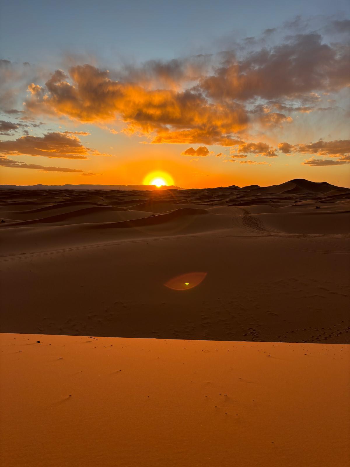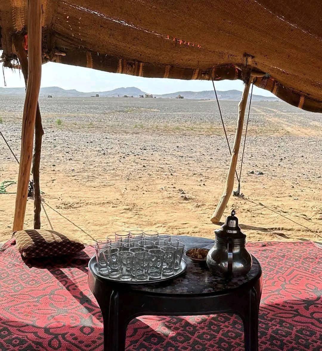 – A l’Erg Chebbi, allotjament en campament fix (tenda condicionada amb dutxa i bany), en règim d’allotjament i mitja pensió (sopar i esmorzar).